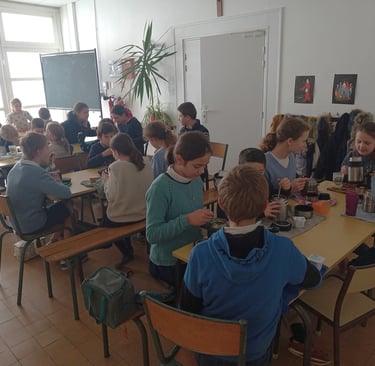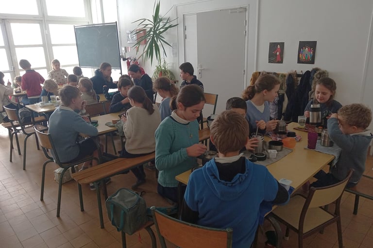 Les élèves peuvent déjeuner sur place, en réfectoire, d'un repas tiré du sac. Pour des raisons réglementaires, le réchauffage du pique-nique n'est pas possible à l'école, aussi la plupart des enfants viennent avec un thermos.